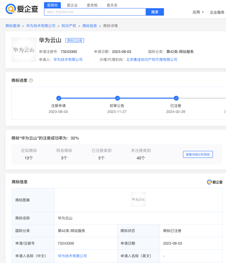 据悉,去年8月,华为申请注册3枚“华为云山”文字商标,其中科学仪器、网站服务类商标已于今年2月注册成功。